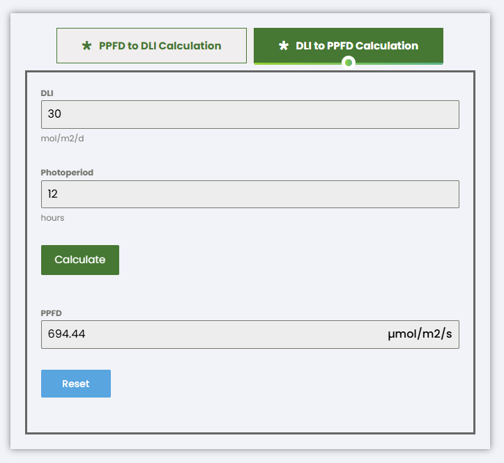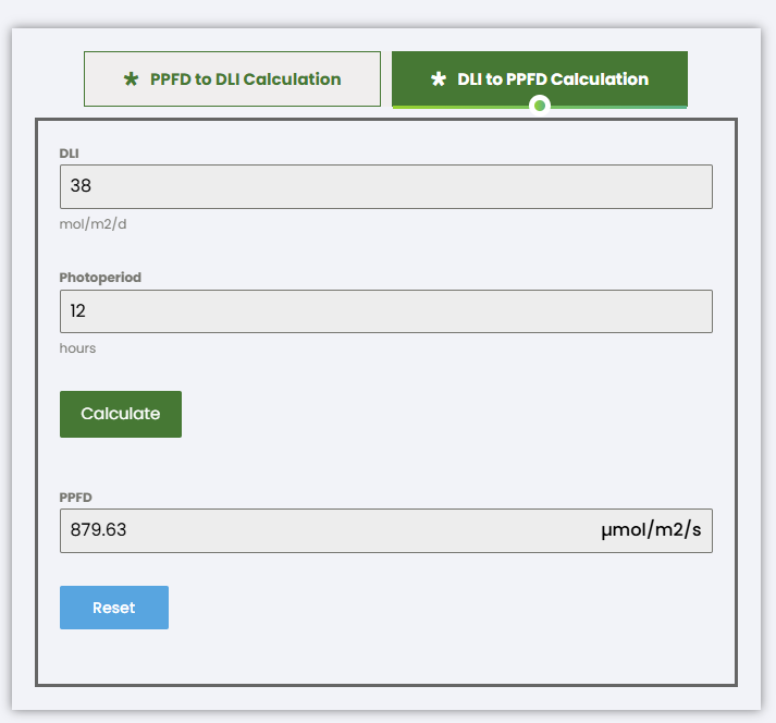 Now, let's convert the 30-38 DLI to PPFD using an online calculator.