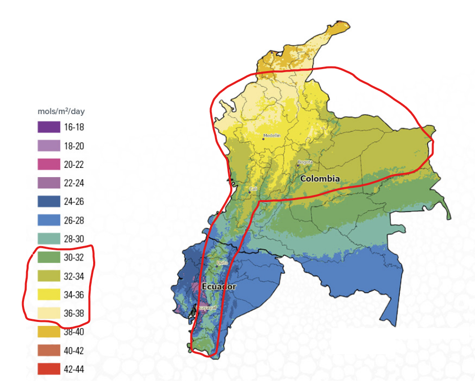However, don't forget we're looking for the mountainous regions. Looking at the map, we can say that 30-38 mols/m^2/day is a good starting point.