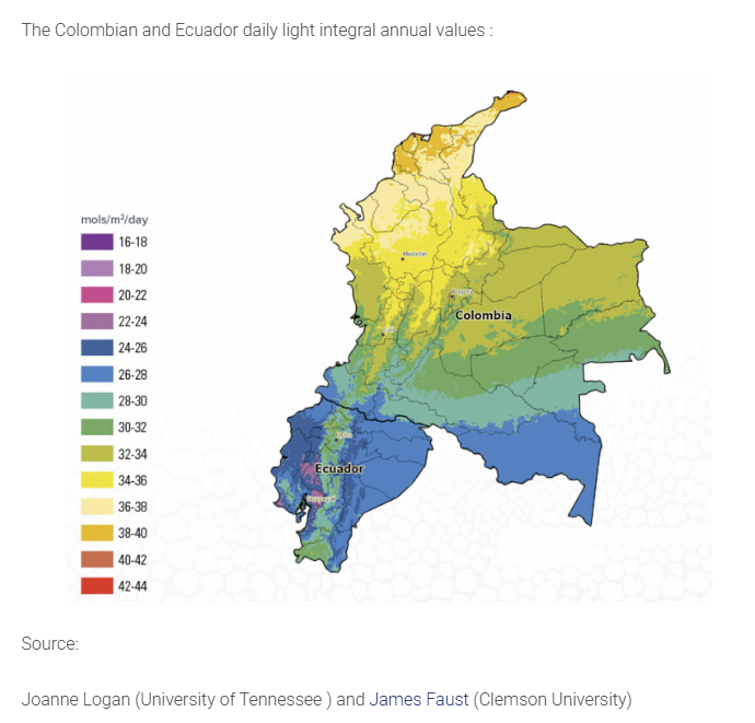 Now, we need to find the daily light integral (DLI) of those regions. DLI measures the amount of photosynthetically active photons per day, or how much plant-usable sunlight hits the ground. With another quick search on Google, we can find the DLI values on a map: