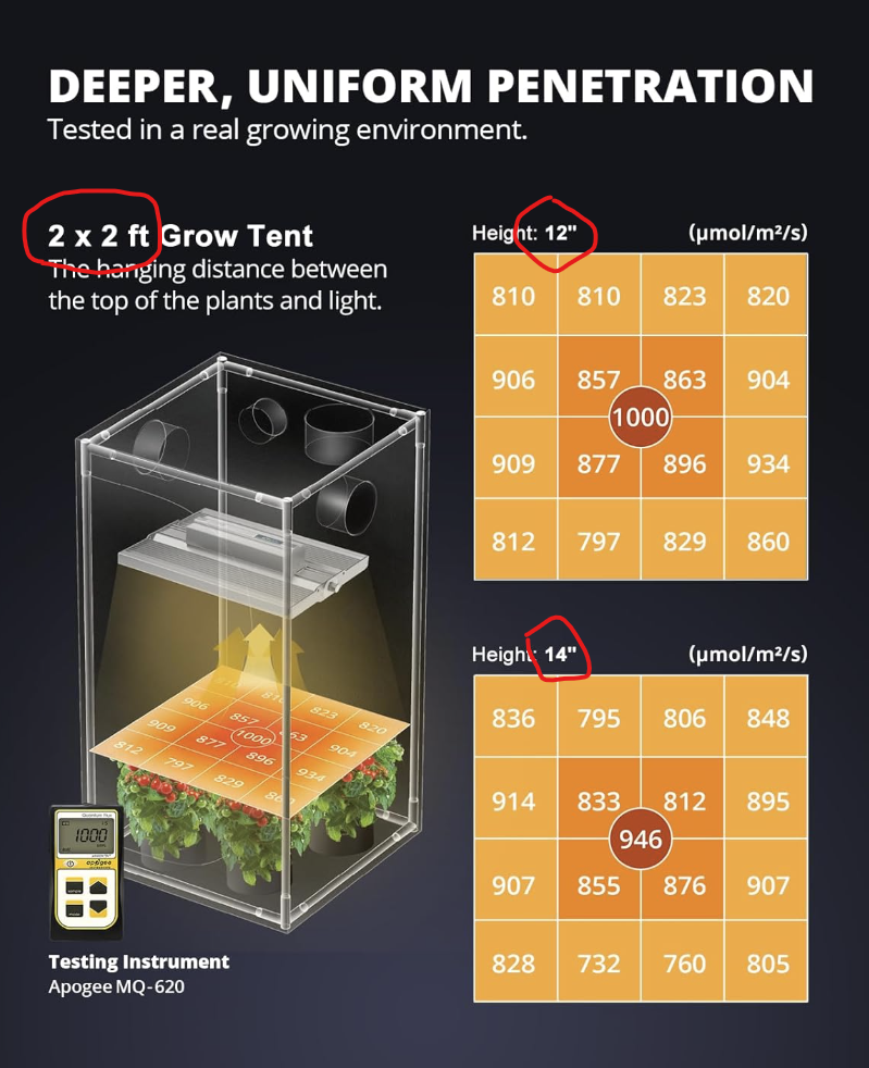 There are a couple things to look out for. We need to note how much of an area this grow light covers, and how far above our plants we should mount the grow light. All these are noted in the image.