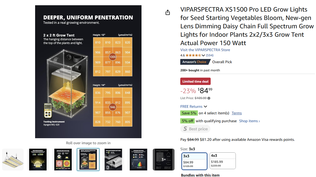 Now all we have to do buy the grow light and follow all the information we gathered. In this case, we'll have our plants in a 2x2 foot area, mount the grow light 12 inches above the plants, and have the grow light on for 12 hours a day. However, we did see that plants on the outer areas may be a little more starved for light, so we may consider lowering the grow light to 10 inches and/or increasing photoperiod to 14 hours.