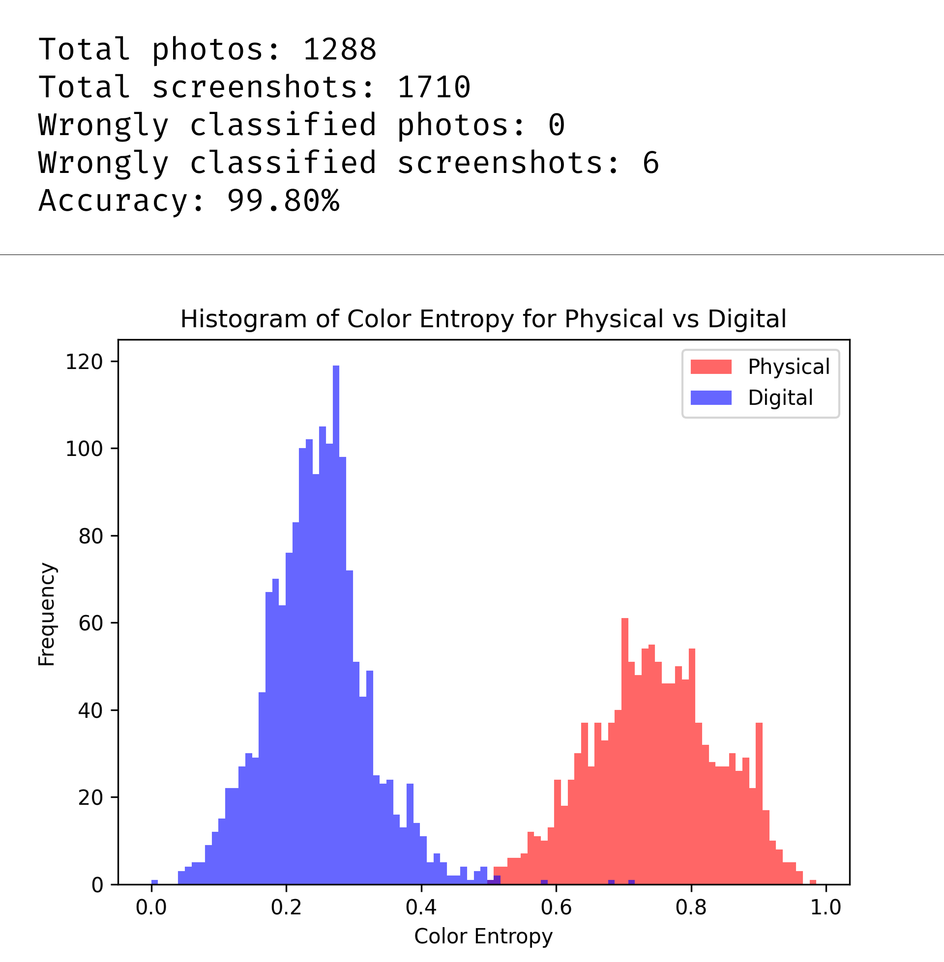 The intuition behind this algorithm is simple. A photo has a large amount of unique colors. Even the blank area of a physical receipt in a photo will have dozens of slightly different whites. The opposite is true of a screenshot -- most of the pixels neatly belong to a handful of colors. This algorithm just measures the distribution of colors.